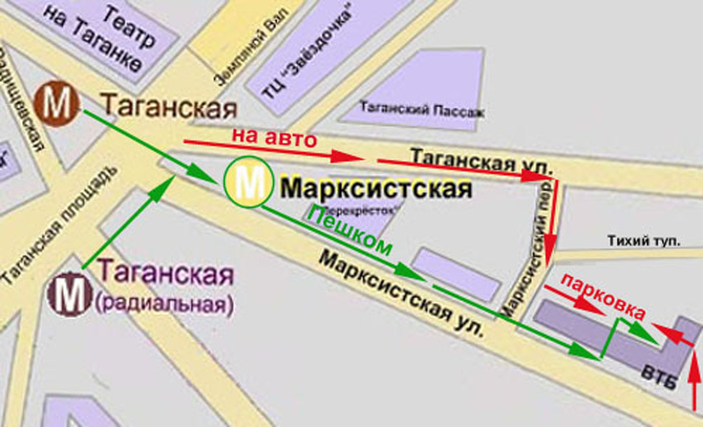 Из метро «Таганская»- кольцевая или радиальная делаем переход на станцию «Марксистская». Из метро выход в город на улицу Марксистская. Далее 3 минуты пешком по улице «Марксистской», никуда не сворачивая. На многоэтажном жилом здании ориентир банк «ВТБ». Посередине здания вход в арку под вывеской «АТЕЛЬЕ». Проходим арку и во дворе сразу направо в угол здания к третьему подъезду.
